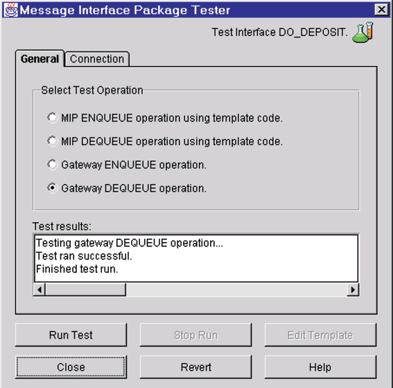 Click Run Test. The Message Interface Package Tester shows the result of the test. The test fails if the database link is not set correctly, or if the gateway is not functioning properly.
